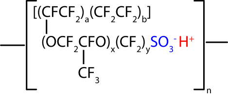 This displays a diagram of the chemical structure of Nafion membrane, which is commonly used in fuel cells. This membrane is composed of carbon-carbon double bonds and hydrogen atoms, as well as other elements such as oxygen and sulfur. The diagram shows these components arranged in a specific pattern, highlighting their arrangement within the overall structure. The image provides an insight into the complex chemistry behind this important material used in fuel cell technology.