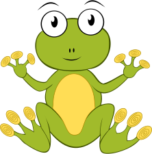 This features a cartoon frog with large, sticky pads on its feet. It is holding up five coins in its hands and appears to be smiling at the camera. The frog's facial expression gives it an amusing and friendly appearance. The coins are scattered around the frog, adding to the playful nature of the scene. Overall, this illustration captures a lighthearted moment with a cute cartoon character.
