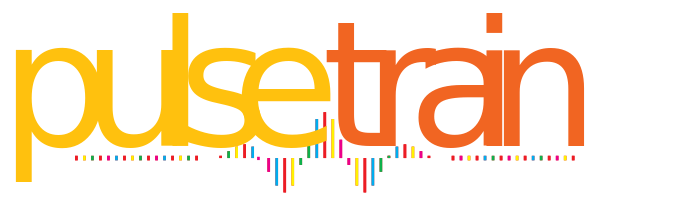 This features a large, bold logo for PulseTrain. The word "PulseTrain" is written in bright yellow letters on top of the image, with each letter being distinct and easily readable. The background consists of a mix of colors, including red, green, blue, and orange, creating an eye-catching contrast against the white background. This logo design effectively conveys the brand's message while also making it visually appealing to potential customers or viewers.