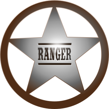 This features a round, brown and silver star with the word "Ranger" written in white. This design is reminiscent of the stars used by rangers during the late 19th and early 20th centuries. The star's color scheme gives it an old-west vibe, which adds to its historical charm. The combination of brown and silver creates a visually appealing contrast that highlights the word "Ranger" in white, making it stand out against the backdrop.