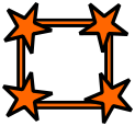 This features a square with an orange frame, which is adorned with stars in each of the four corners. The stars are positioned at various angles and distances from one another, creating a visually appealing pattern. The overall design gives off a sense of warmth and playfulness, making it suitable for use as a decorative element or an artistic piece.