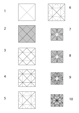 This displays a collection of ten different illustrations of pieces of origami paper with lines on them, indicating where the paper needs to be folded to create a pattern. These diagrams are arranged in a grid-like fashion and are labeled with numbers one through ten. Each illustration showcases various shapes and designs that can be created using these origami papers. The images provide clear instructions for those looking to engage in this creative activity, offering an opportunity to explore the art of paper folding.