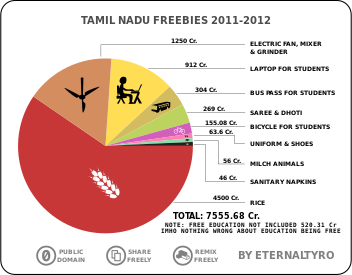 This displays a pie chart that illustrates the various free items offered by the Tamil Nadu government for the 2011-2012 fiscal year. There are several categories of freebies, including education and healthcare. A total of 1658 crore rupees have been allocated to provide these benefits to the public. The chart is divided into different sections, each representing a specific category of free items. For instance, there is a section for books, another for bicycles, and yet another for uniforms. Additionally, there are categories for laptops, buses, and even animals such as cows and horses. Overall, the chart provides an overview of the various freebies offered by the Tamil Nadu government to its citizens.