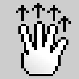 This features a hand with five fingers, each finger is represented by a small cross. These crosses are arranged in such a way that they form the shape of a hand. The hand appears to be made up of squares or pixels, giving it an iconic look. This design could represent a dedicated set of multitouch functions icons in pixel cursor style.