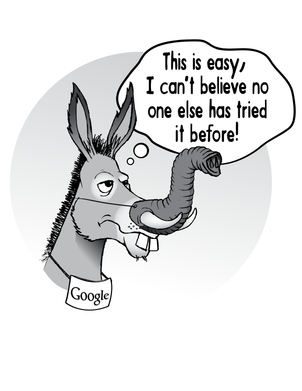 This features a donkey with an elephant tusk mask on its face, wearing a necklace that has Google written on it. The donkey appears to be making a funny or silly expression as it holds the tusk up to its mouth. This whimsical scene is likely meant to entertain and amuse viewers who may find humor in the combination of an elephant tusk mask with a Google necklace.