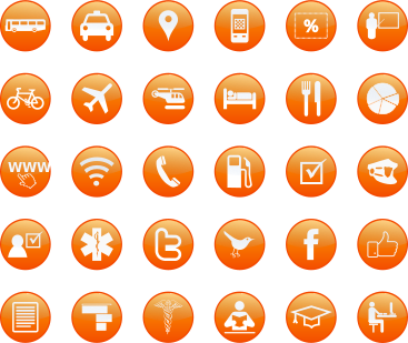 Tags: airport, bicycle, bus, chart, check, color icons, computer, education, emergency, facebook, food, gas, helicopter, hotel, learn, like, link, map, medical, police, project, qr, restaurant, school, taxi, telephone, text, twitter, user, wifi, icons orange