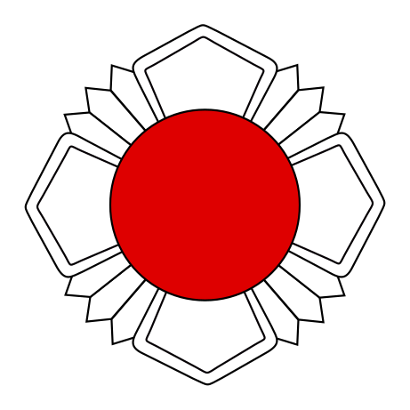 This features a red circle with white designs surrounding it. The circle is located in the center of the design, and its vibrant color stands out against the white background. The intricate pattern created by the white shapes around the red circle adds depth and visual interest to the overall composition. This unique design could be used as an emblem or logo for a specific organization or brand.