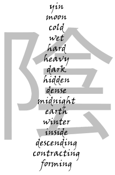 This features a list of words written in black, arranged vertically. These words are displayed on top of a backdrop with Chinese characters. The list includes various terms such as "cold," "wet," "hard," and "heavy." There is also an entry for "hidden" and one for "midnight." Other words include "earth," "winter," "inside," "descending," "contracting," and "forming." The arrangement of these words creates a visually appealing display, possibly representing different aspects or concepts related to the Chinese language.