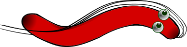 This features a red, curly object that resembles an eel or a snake. It is situated on top of a white background, which provides a stark contrast to the vibrant color of the main subject. The red eel-like creature appears to be moving across the surface, giving it a dynamic and lively appearance.