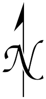 This features a compass rose with the letter "N" in the center. It is designed to indicate the direction of north on a map. The graphic has been improved by converting all text elements into paths, allowing for system-independent display and making the arrow a closed, filled path. A white background or drop shadow surrounds the arrow, enhancing visibility on both light and dark map images. To maintain the relative width of the drop shadows when scaling the image, it is essential to enable "Scale stroke width" in the Transform preferences within an SVG editor. The font used for the letter "N" is URW Chancery.