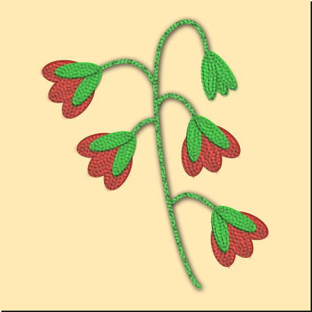 This features a close-up of an embroidered red flower with green stems. There are four red flowers attached to the same stem, creating a visually appealing arrangement. The stems are made from yarn and have been skillfully crafted into the shape of leaves. This artistic display showcases the intricate details of the embroidery work, making it an attractive piece for viewers.