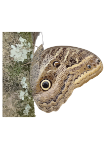 This features a large, brown butterfly perched on the side of an old tree. It appears to be peeking out from behind the tree trunk, creating a sense of curiosity and interest in its surroundings. The butterfly's wings are spread wide, showcasing their intricate patterns and colors. This scene captures the beauty and delicacy of nature, as well as the unique characteristics of the butterfly species.