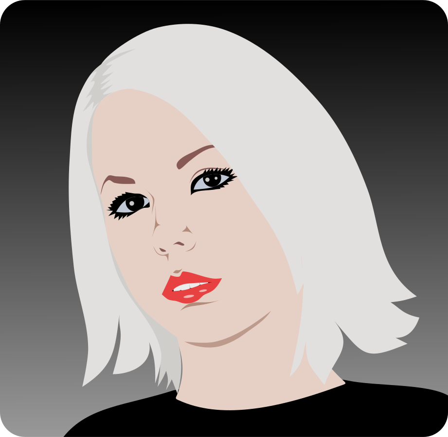 This features a woman with blonde hair, wearing black lipstick and eye shadow. She has a smirk on her face as she poses for the camera. Her makeup is well done, giving her an elegant appearance. The woman's hair is styled in a short cut, adding to her overall look. The image is a colorful cartoon drawing of the woman, making it visually appealing and eye-catching.