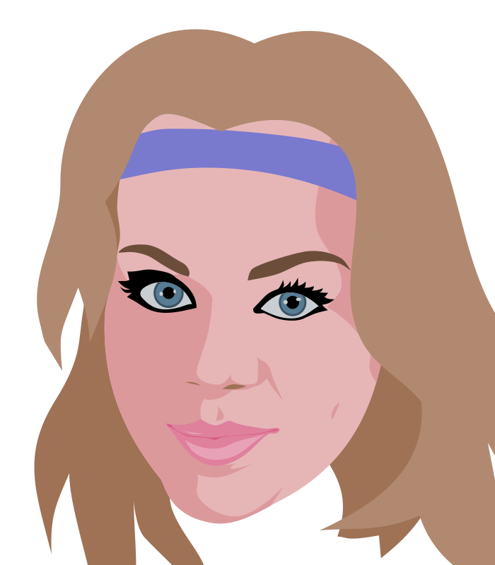 This features a woman with long brown hair, wearing a purple headband. She has blue eyes and is smiling for the camera. Her makeup includes eyeliner on her upper lashes, giving her a stylish appearance. The woman's face is prominently displayed in the center of the image, capturing her beauty and charm.