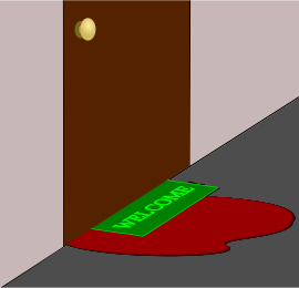 This features a door with a green sign that reads "welcome" on it. The door is open, and the sign appears to be placed in front of it. There are also some red stains on the floor near the door, which could indicate a spill or other mess. The scene gives off an eerie vibe, possibly suggesting a Halloween-themed setting.