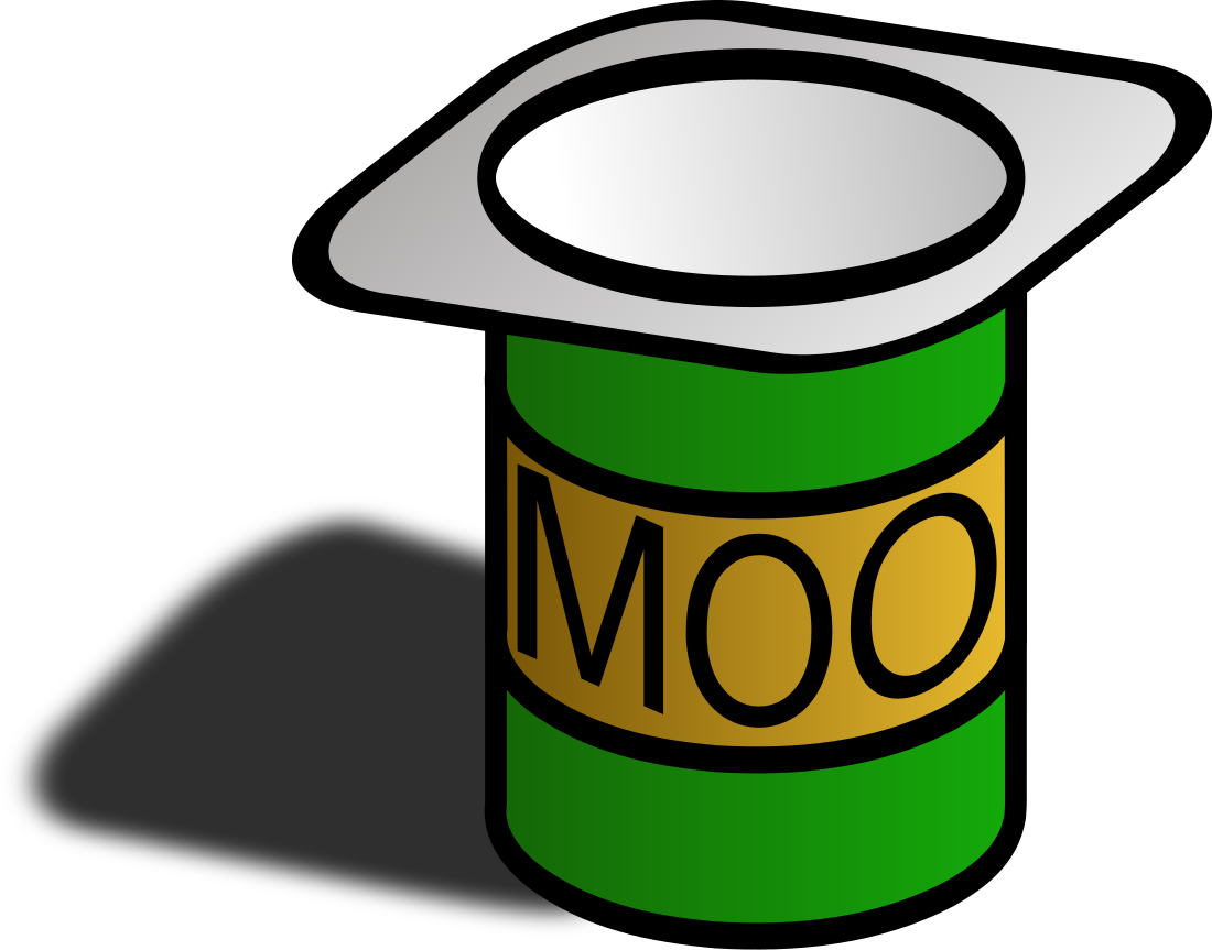 This features a green and yellow carton with the word "Moo" written on it. The container is placed in front of a shadow, which adds depth to the scene. The colorful design of the cup makes it stand out against its surroundings. This creative presentation of the product could be used for advertising or promotional purposes, as it draws attention and creates an interesting visual effect.