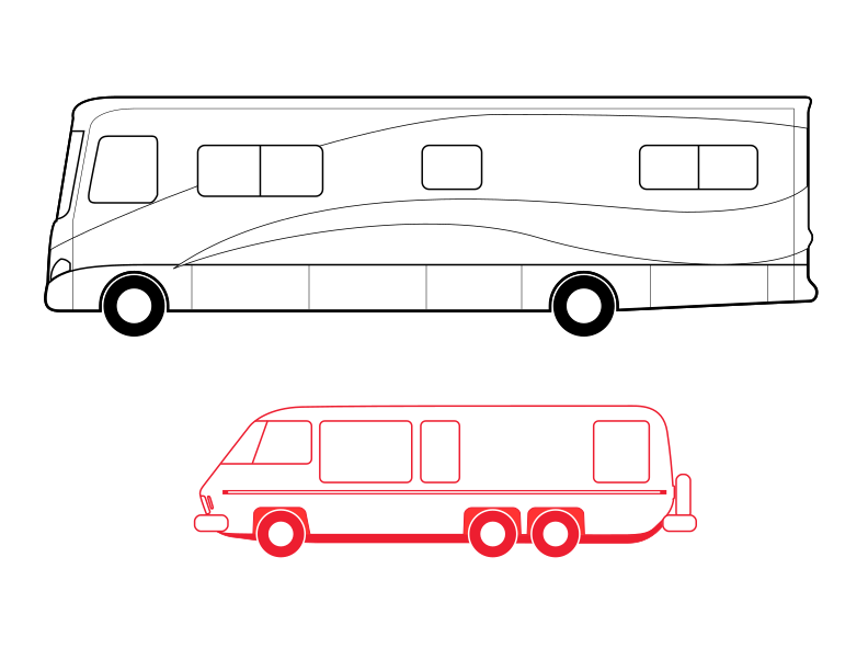 This features two different types of vehicles, a large motorhome and a smaller one. The larger motorhome is reminiscent of a "diesel pusher" and has a more prominent presence in the scene. On the other hand, the smaller vehicle appears to be based on the vintage GMC motorhome made in the USA from 1972-1978. The two vehicles are positioned next to each other, with the larger one occupying most of the space and the smaller one being a bit more compact.