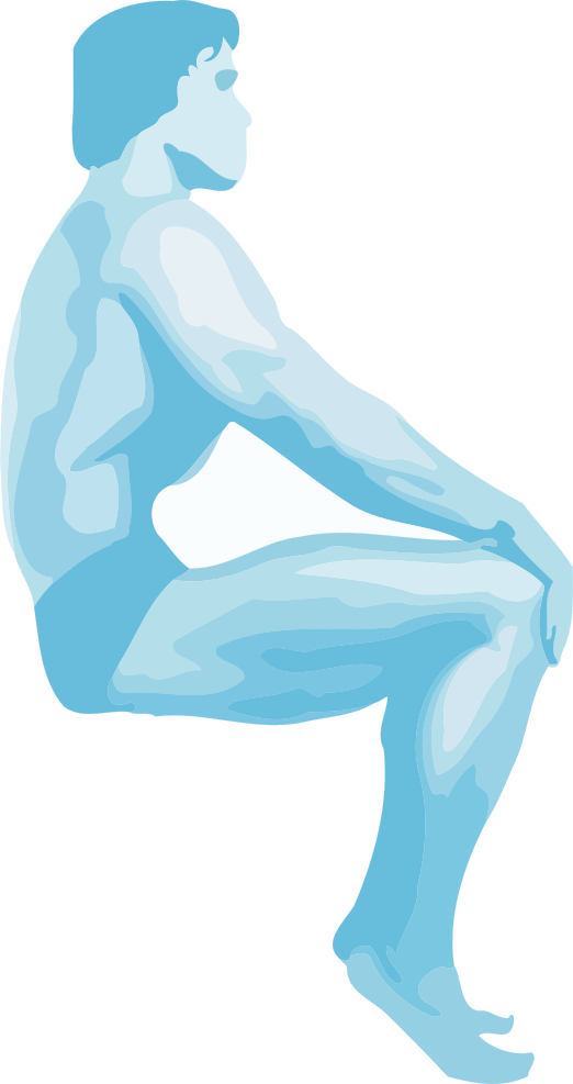 This features a blue and white drawing of a man's torso, showcasing his muscular physique. He is sitting down with one leg up on the wall, giving an impression of strength and power. The drawing captures the essence of the male body in a minimalist yet detailed manner.