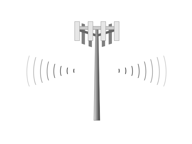 This features a gray cell tower with two cell signals on either side of it. The tower is situated in the middle of an open area, and there are no other objects or people visible in the scene. The cell tower appears to be a prominent focal point within this empty space, emphasizing its importance as a communication hub for mobile devices.