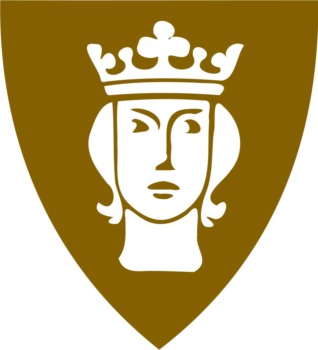 This features a brown and white shield with an intricate design. At the center of the shield, there is a portrait of a woman's face, which appears to be a part of the coat of arms. The woman has long hair and is wearing a crown on her head. The overall design gives off a sense of royalty and elegance.