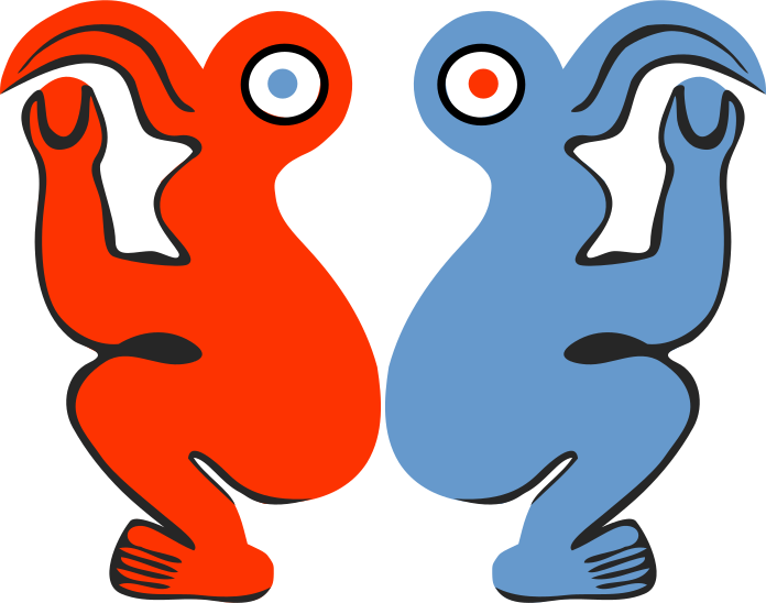 This features two colorful, cartoon-like birds standing next to each other. They are both wearing red and blue colors, with one bird being predominantly red while the other is primarily blue. Each bird has a pair of eyes, giving them an expressive appearance. Their legs are positioned in such a way that they appear to be dancing or posing for a picture. The overall scene exudes a sense of fun and playfulness, with the two birds standing out as the main focus of the image.