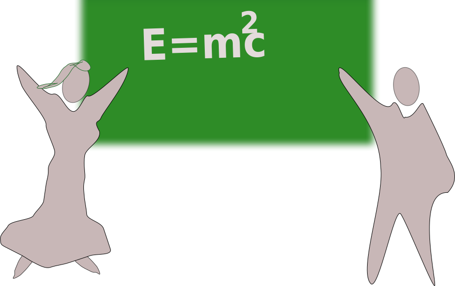 This features a whiteboard with the formula E=mc^2 written on it. Two silhouettes of people are standing in front of the board, one on the left and another on the right side. They appear to be holding up their hands as if they are celebrating or acknowledging the formula's significance. The scene gives off a sense of excitement and curiosity about the concept being presented.