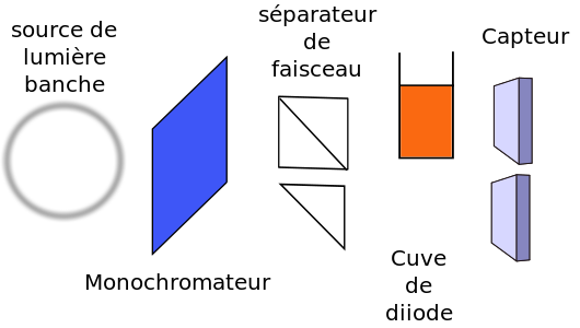 This displays a diagram of a spectrophotometer, which is an instrument used to measure the intensity of light as it passes through a sample. There are several diagrams and labels on the page, including one that reads "source de lumière" (light source) in the top left corner. Other labels include "capteur" (sensor), "faisceau" (beam), "faiseau" (slit), "banche" (bench), and "coupe" (cut). The diagrams showcase different parts of the spectrophotometer, including a light source, sensor, slit, and bench.