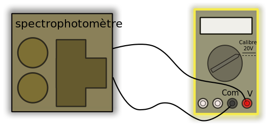 This features a device that appears to be a spectrophotometer, which is being used for measuring light. It has two knobs on the top and bottom of it, possibly for adjusting settings or controlling the device. A small yellow box is connected to the spectrophotometer, indicating that they are working together as part of an experiment or measurement process. The image also includes a remote control placed near the spectrophotometer, suggesting that it may be used to operate the device remotely. Overall, this scene appears to depict a scientific or technical setting where precise measurements and observations are being made using specialized equipment.
