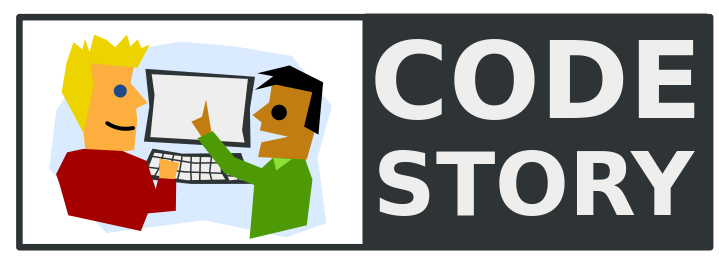 This features a cartoon of two men, one on the left and another on the right. They are both holding laptops, with one man's laptop positioned higher than the other. Above them is a sign that reads "Code Story." The scene appears to be a comic strip or an animated advertisement for Code Story.