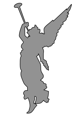 This features a silhouette of an angel playing a trumpet. The angel is depicted in mid-air, holding the instrument with one hand while its other arm is raised upwards. The wings of the angel are spread out behind it, giving the impression that it's soaring through the air. The overall scene has a sense of motion and freedom, as if the angel is performing a captivating musical piece.