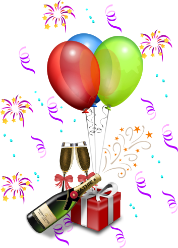 This features a festive scene with various items arranged on a table. There are two champagne bottles, one placed near the center of the table and another towards the left side. Two champagne flutes can be seen as well, one closer to the right edge of the table and the other slightly further back. A present is also visible on the table, located in the middle-right area. In addition to these items, there are two balloons, one towards the top left corner and another at the bottom left side of the image. Two fireworks can be seen as well, with one near the center-left and the other slightly above it. A celebratory atmosphere is created by the presence of these objects, suggesting a joyful event or occasion.