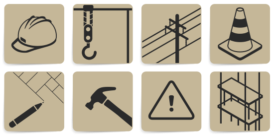This features a collection of eight different construction logos, each representing various aspects of the industry. These logos include a hard hat, which is an essential piece of safety equipment for workers on construction sites; a crane, symbolizing lifting and moving heavy objects; a utility pole, indicating electrical infrastructure; a traffic cone, used to mark off hazardous areas or warn of potential dangers; a pencil, representing planning and design; a hammer, signifying the physical labor involved in construction; a street sign, indicating roadwork or changes in traffic patterns; and finally, a scaffold, which is a temporary structure used to support workers during construction projects. The logos are arranged in a square formation, showcasing each symbol's unique function within the industry.
