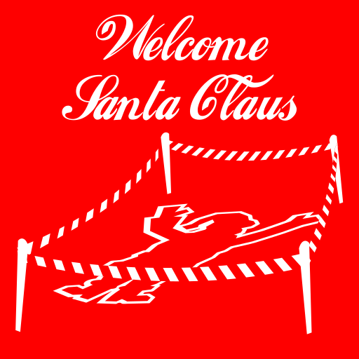 This features a red poster with the words "Welcome Santa Claus" written above it. Below this text, there is an illustration of Santa Claus in a crime scene, possibly depicting him as a criminal or a suspect. The poster has a playful and humorous theme, combining elements of Santa Claus's traditional image with the concept of a crime scene.