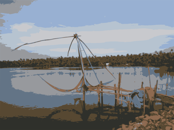 This features a large fishing net floating on the water, with its structure resembling a boat. The net is positioned in the middle of the scene and appears to be quite large, covering most of the water's surface. There are several smaller boats scattered throughout the area, some closer to the shore while others are further out into the water. These boats vary in size and shape, adding diversity to the overall scene. The presence of these boats suggests that this location is a popular spot for fishing or other water-based activities.