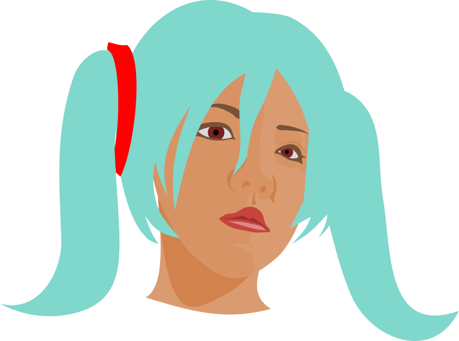 This features a woman with long, teal hair styled in pigtails. She has one of her pigtails tied with a red ribbon. Her eyes are open and she appears to be looking slightly to the right. The overall appearance is that of an animated or illustrated character.
