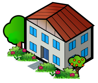 This features a large house with a red roof, surrounded by trees and grass. The house has many windows, including some on the second floor, which are black in color. There is also a door located near the center of the house. The scene appears to be an illustration or drawing, possibly depicting a residential area.