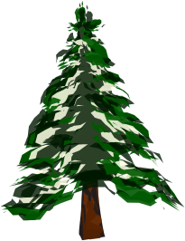 This features a three-dimensional illustration of a large green pine tree with a brown trunk. The tree is covered in snow, giving it an icy appearance. The tree's branches are visible and extend outwards from the main trunk, creating a sense of depth and dimension to the scene. This artistic representation captures the beauty of nature during wintertime, as the pine tree stands tall amidst the snowy landscape.