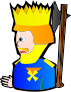 This features a cartoon-like character with a crown on his head, holding an arrow in one hand and a shield in the other. He appears to be wearing blue clothing and has a yellow beard. This character seems to be a knight or a warrior, possibly from a medieval setting. The overall appearance of the image is quite colorful and vibrant, with the character standing out as the main focus.