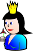 This features a cartoon drawing of a woman wearing a crown, which is placed on her head. She appears to be holding an object in her hand, possibly a cup or a cell phone. The woman's outfit consists of a blue dress and she has a necklace around her neck. The overall appearance of the image gives off a playful and whimsical vibe.