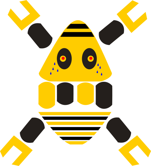 This features a yellow and black beetle with an angry expression. It has four arms, two on top and two on the bottom, giving it a unique appearance. The beetle's eyes are open wide, adding to its intense look. This interesting design could be used for various purposes such as a logo or decoration.