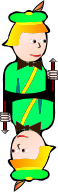 This features a cartoon character, possibly a boy or a man, wearing a green and yellow hat. He is holding an arrow in his hand, giving the impression that he might be a hunter or an archer. The character appears to be peeking around a corner, adding a playful element to the scene. The image itself seems to be a reflection of this character, as it is presented in mirror form.