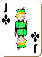 This features a deck of cards with the Jack of Clubs card prominently displayed. This card is unique as it has an illustration of a man wearing a green and yellow hat, holding a knife in his hand. The card itself is surrounded by other cards, creating a visually interesting composition. The overall design of the deck showcases various cards with different illustrations, making it an engaging and creative piece for card enthusiasts or collectors.