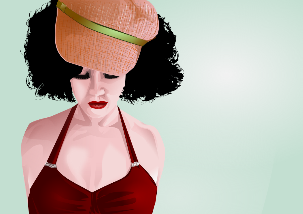 This features a woman wearing a red dress and a straw hat. She is standing in front of a green wall, which serves as the background for the scene. Her outfit includes a red top that complements her overall appearance. The woman appears to be posing for the camera, possibly for an artistic or promotional purpose.