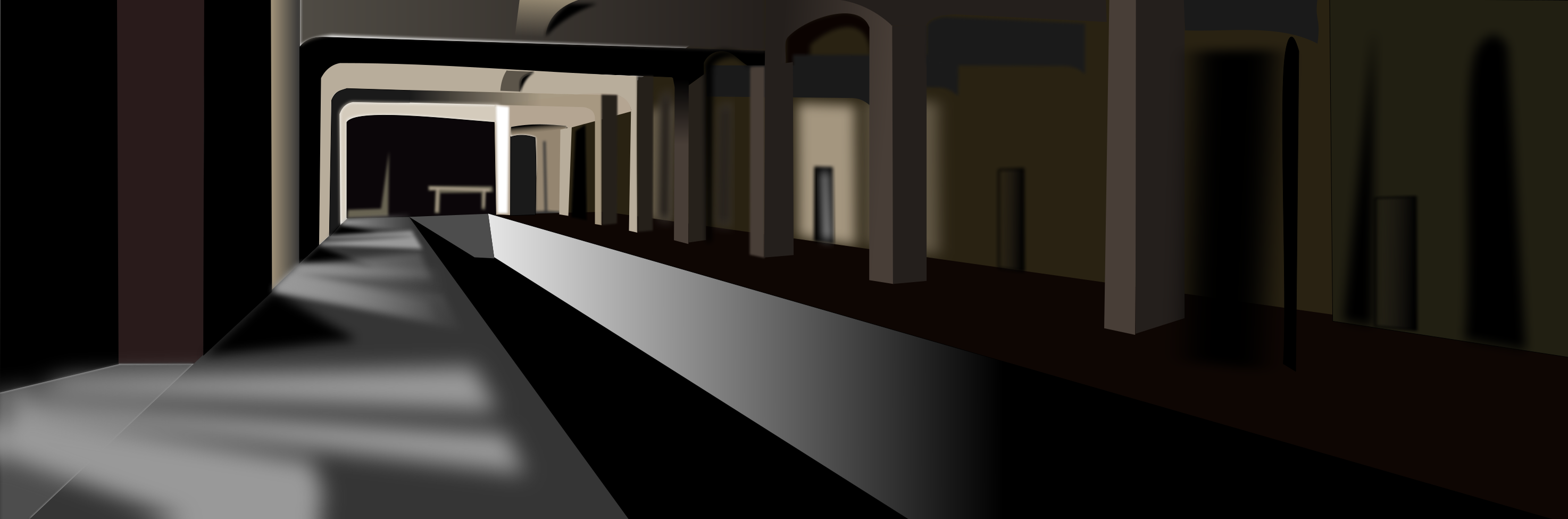 This depicts a long, dark subway tunnel with an open ceiling. The tunnel is illuminated by lighting, creating a sense of depth and space within the scene. Along the length of the tunnel, there are several benches placed at regular intervals for passengers to sit and rest during their journey. These benches are positioned in various orientations, some facing forward while others face sideways or backward. The overall atmosphere of the image is one of a well-lit, functional subway system designed to accommodate the needs of its users.