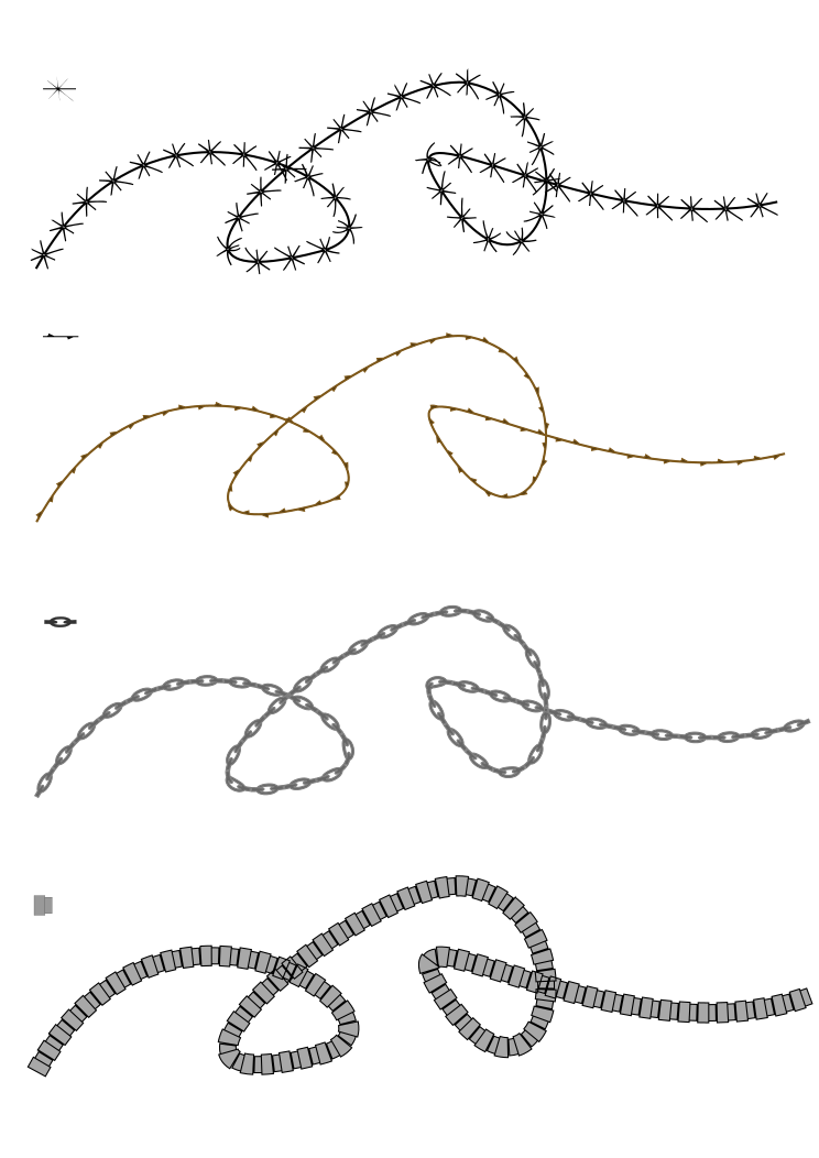 This displays a collection of four different patterns on path. Each pattern is unique and showcases various styles, making it an interesting visual display. These patterns are likely used for decorative purposes or as part of a design project. They can be found in the form of curly lines, wavy shapes, and other intricate designs that add character to any space they occupy. The collection is presented in a visually appealing manner, making it an attractive piece for anyone interested in artistic patterns or decorative elements.