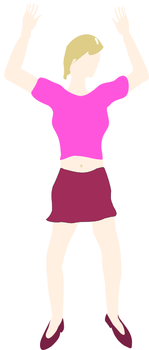 This features a woman wearing a pink shirt and a red skirt. She is standing with her arms raised above her head, possibly in the process of doing a cartwheel or some other physical activity. Her outfit consists of a short sleeve top and a skirt that reaches down to mid-calf length. The woman's posture suggests an active lifestyle and a sense of confidence in her abilities.