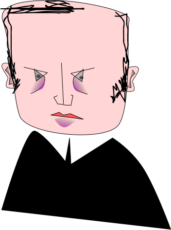 This features a cartoon man with a black and white color scheme. He has a distinctive look, as his eyes are purple and he is wearing lipstick. His facial expression appears to be angry or discontented, giving the impression that he might not be happy about something. The man's hair is short and black, adding to his overall appearance.