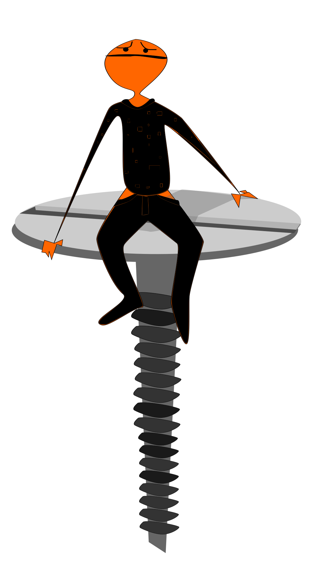 This features a cartoon man sitting on top of a table, which is made up of several screws. He appears to be looking at the camera with an angry expression. The man's position suggests that he might be in a defensive or aggressive stance. The screws are arranged in such a way that they form the surface of the table on which the cartoon man is sitting. This unique design adds a creative and artistic touch to the scene, making it an interesting visual composition.