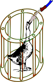 This features a goose inside of a cage, with its head sticking out. The bird is standing on one leg and appears to be looking upwards. The cage itself has a metal design, giving it an industrial appearance. The goose's position within the cage suggests that it might be in captivity or being held for some reason.