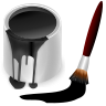 This features a bucket of paint with a red brush inside, placed on a white background. The bucket is gray in color and has black paint inside it. The brush is brown and appears to be leaving a trail behind as it moves through the paint. This scene could represent an artistic or creative process where the artist uses the brush to apply paint onto a canvas or other surface.